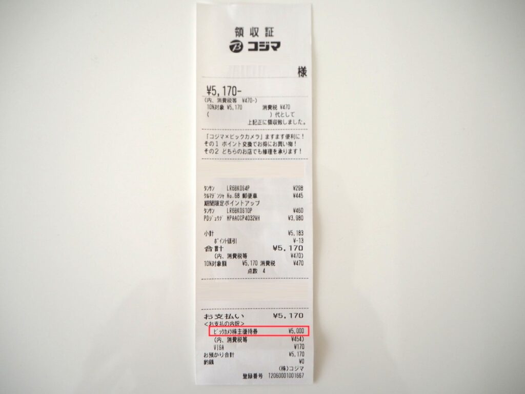 レシートを見るとコジマでビックカメラの株主優待を使用したことがわかると思います。
