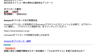その他 コエキクの株主アンケートに当選!薄謝はAmazonギフトカード500円分!! こんにちは、ホタテです。コエキクの株主アンケートに当選しましたのでご紹介します。コエキクの薄謝はこちら!ダイショーの株主アンケートに当選ということで、メールが送られてきました。メールに記載のあるように薄謝の内容はAmazonギフトカード50... 2025.10.11 その他株主優待