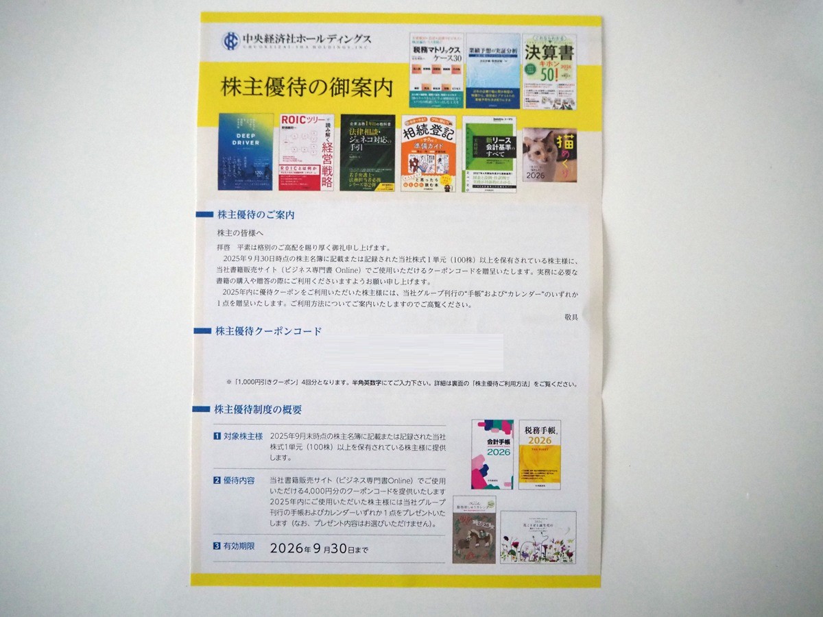 中央経済社ホールディングスの株主優待は自社の販売サイト「ビジネス専門書 online」で利用できる4,000円分のクーポンコードです。
