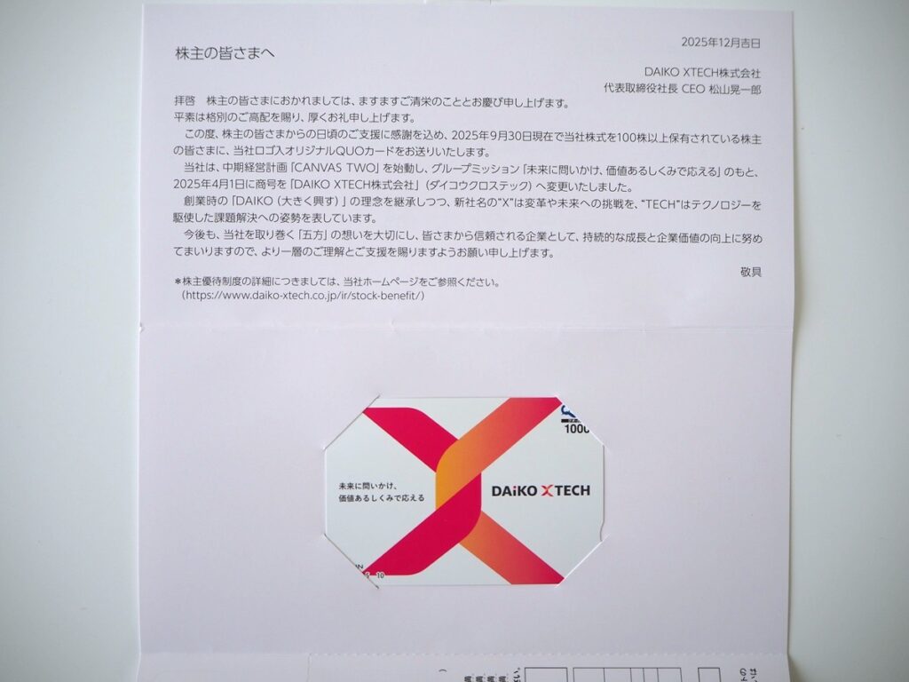 DAIKO XTECHより株主優待が届きましたのでご紹介します。