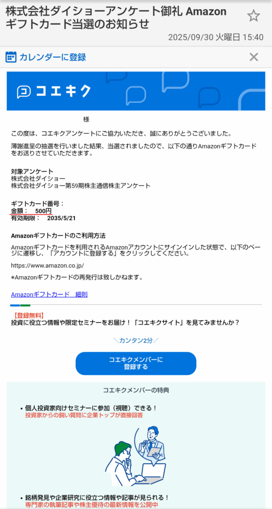 全く当選を期待していませんでしたが、コエキクのダイショーの株主アンケートでAmazonギフトカード500円分が当選しました。