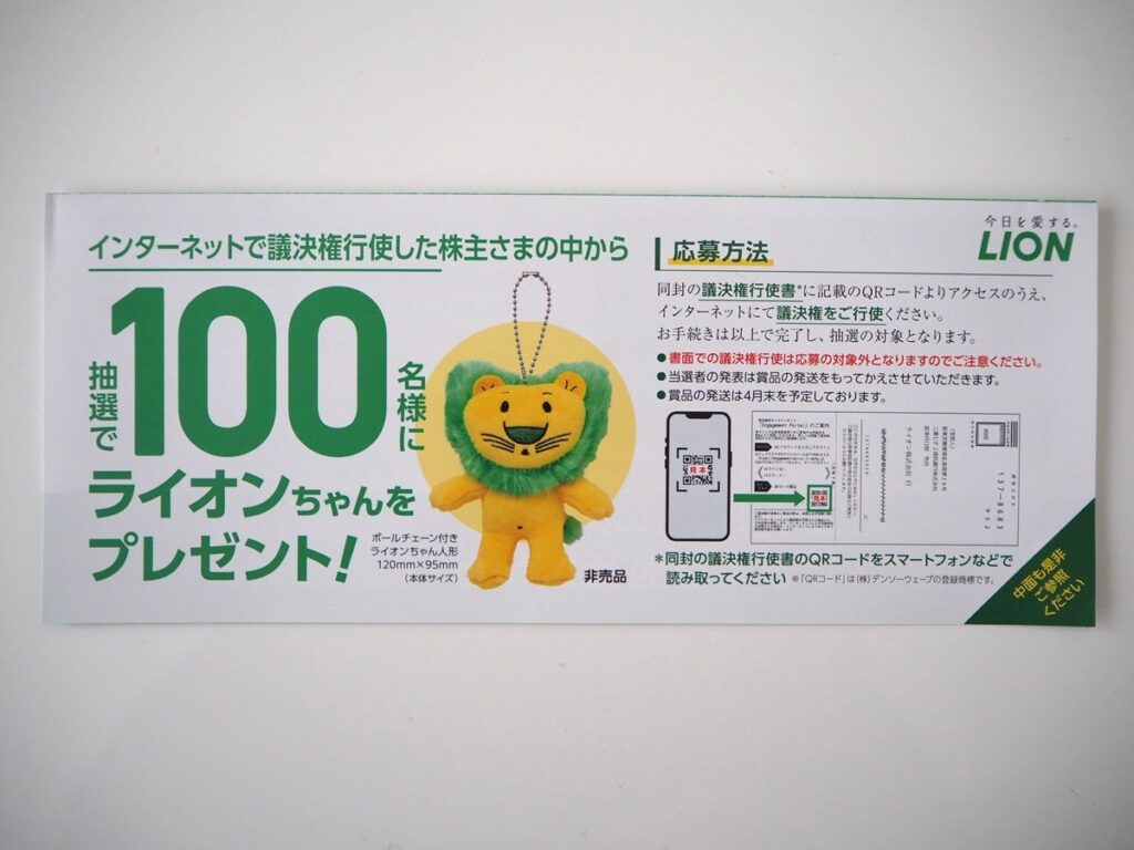 また、今回はインターネットでの議決権行使でライオンちゃんが当たるキャンペーンを行っていました。