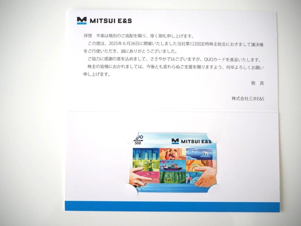 三井E&Sより議決権行使のお礼のクオカードが届きましたのでご紹介します。