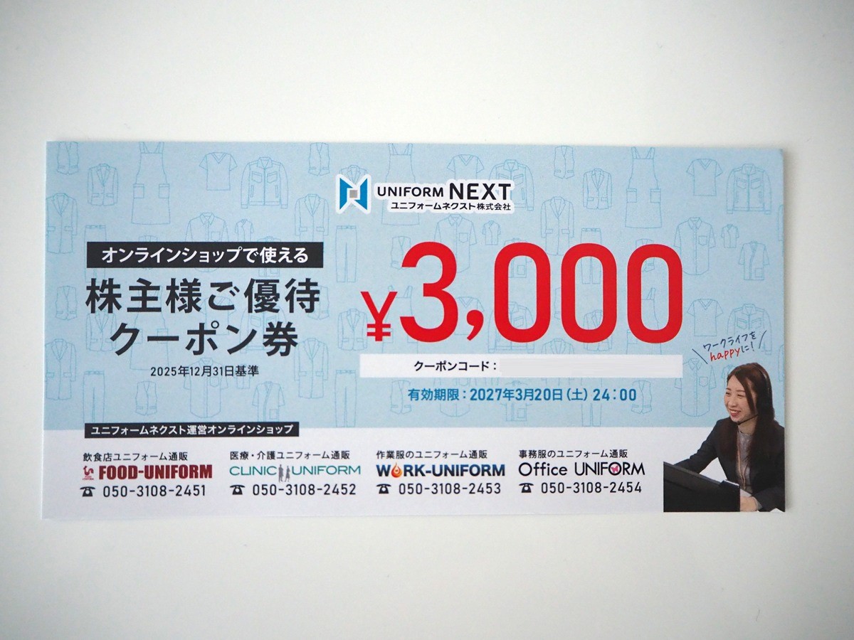 ユニフォームネクストの株主優待は自社オンラインショップで利用できるクーポン券です。