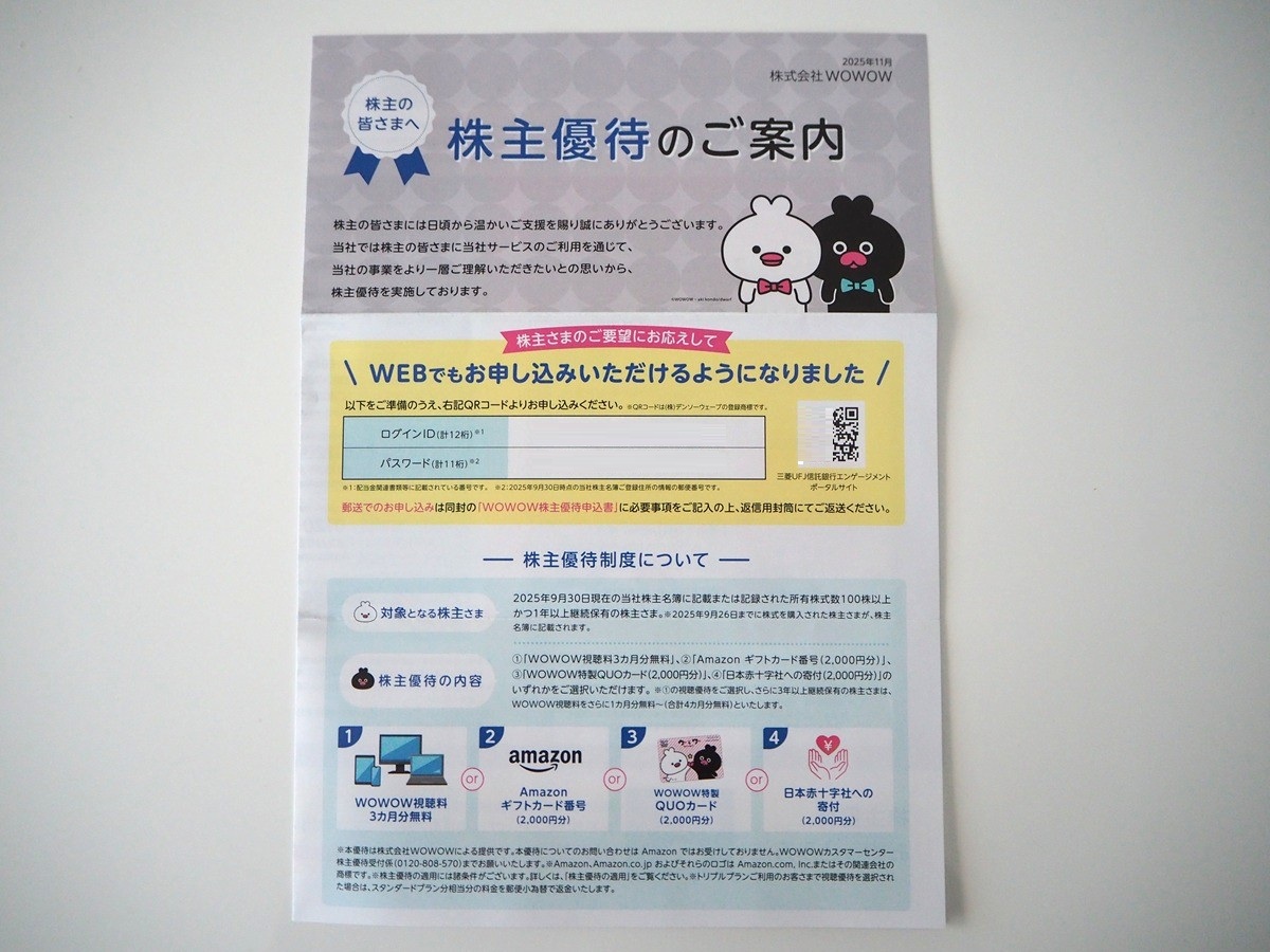 | 100株以上 | 1年以上 | 1.視聴優待WOWOW視聴料3か月無料 ※3年以上継続保有で4か月分無料 2.Amazonギフトカード番号(2,000円分) 3.WOWOW特製QUOカード(2,000円分) 4.日本赤十字社への寄付(2,000円) |