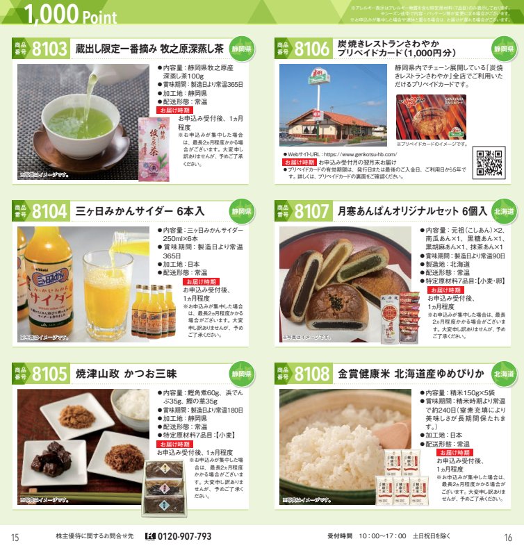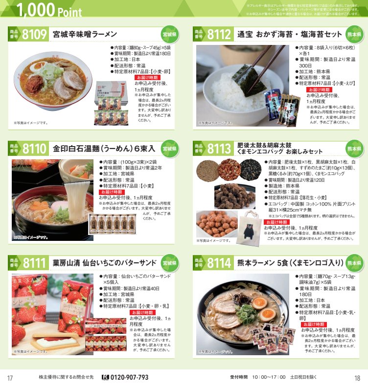 保有株式数、保有期間に応じて以下のポイントが貰え、カタログの商品から選択することが出来ます。